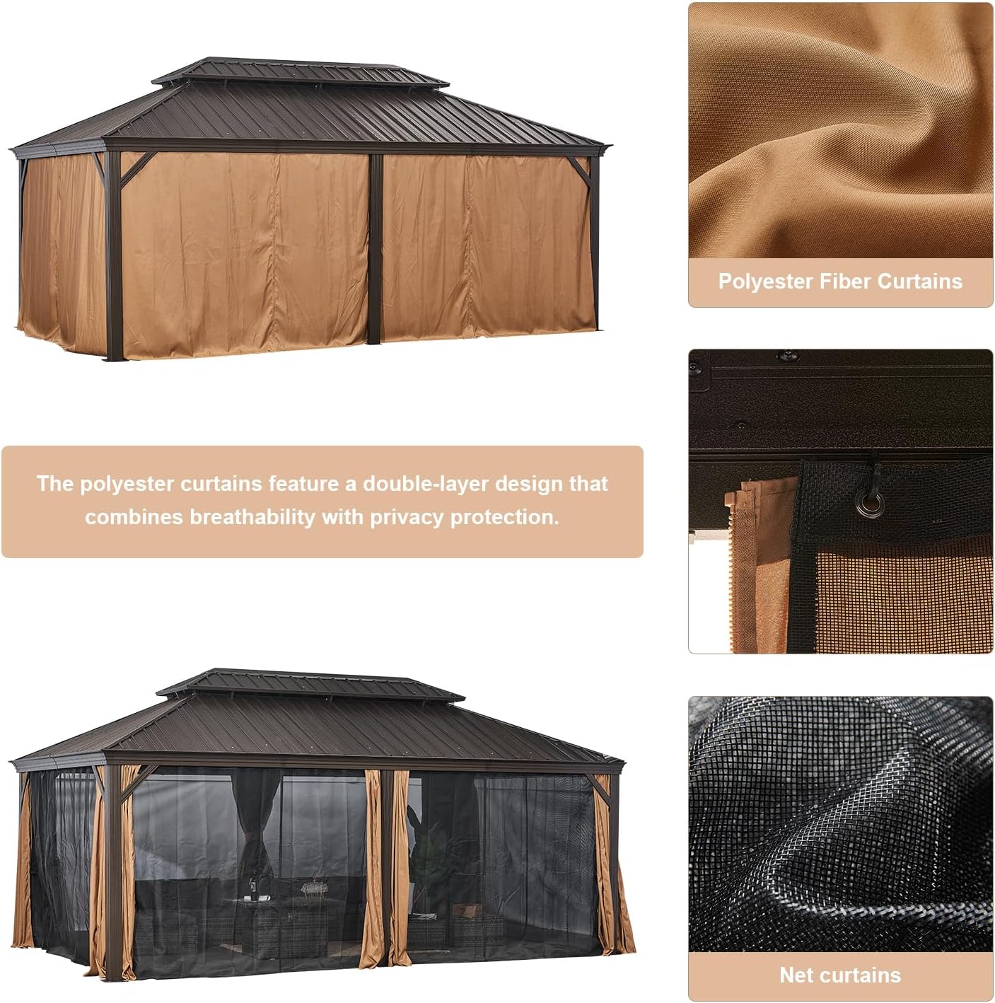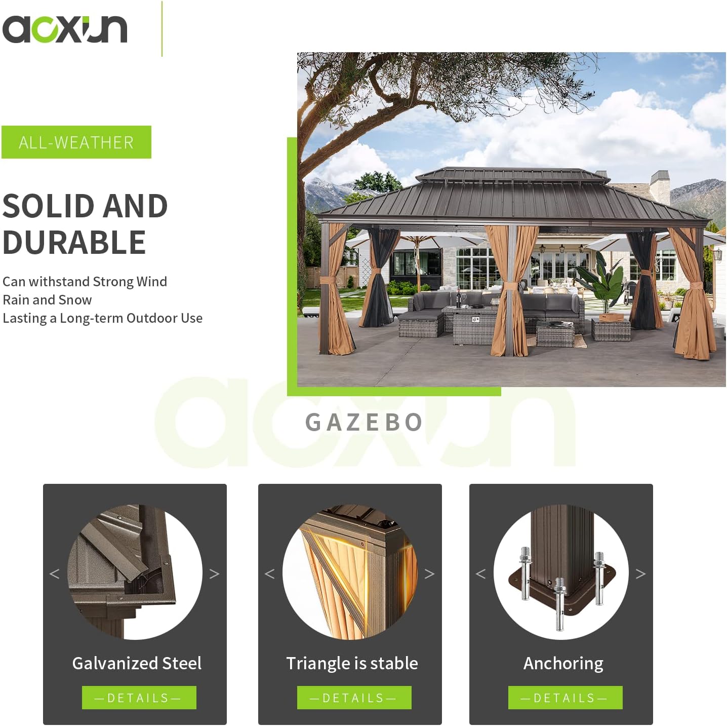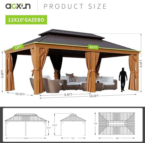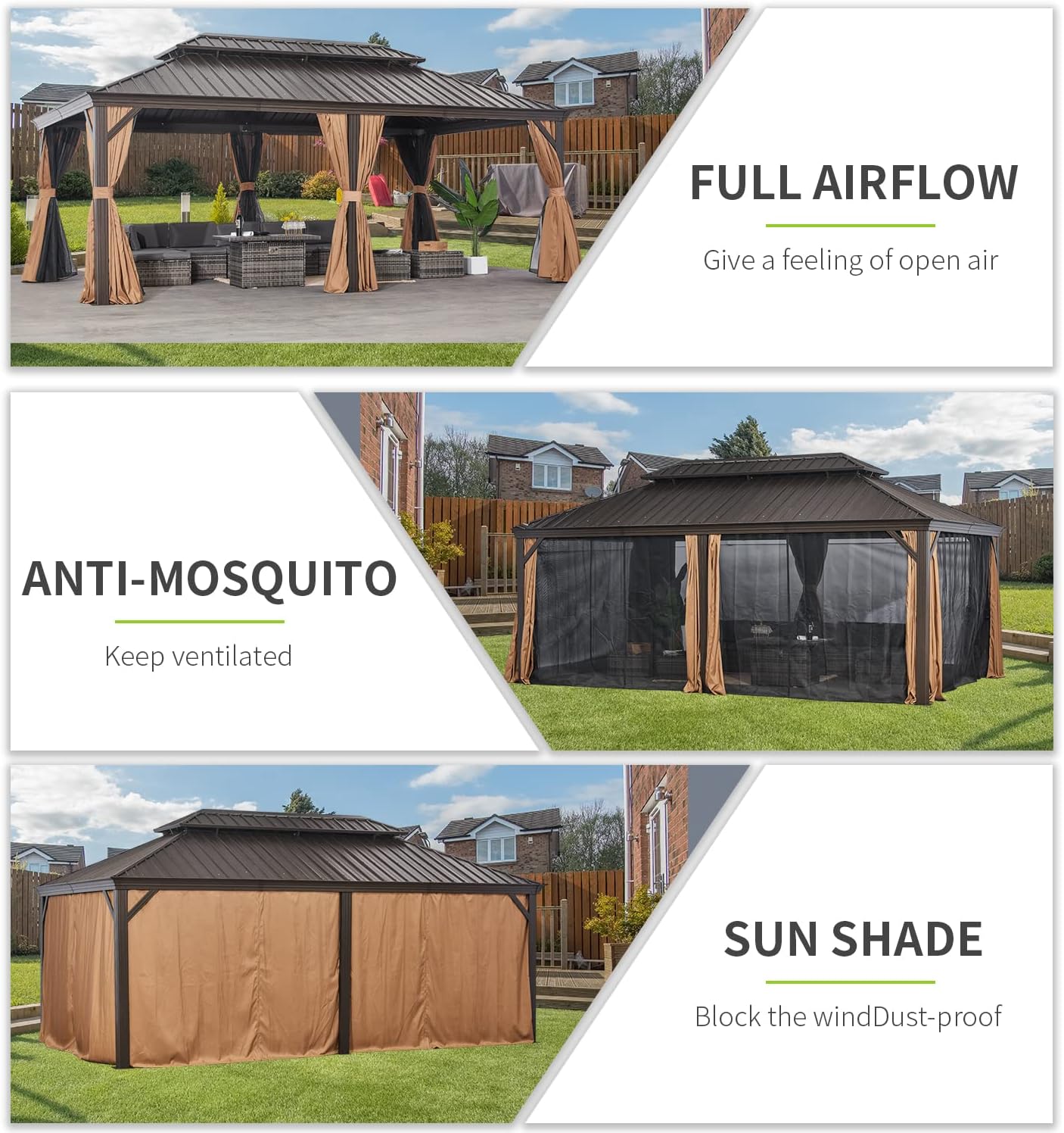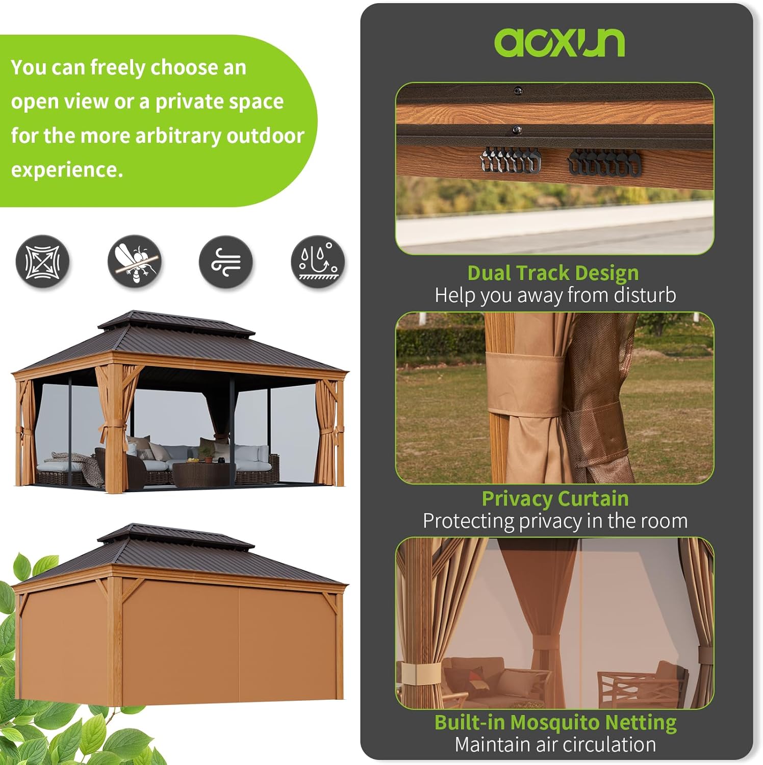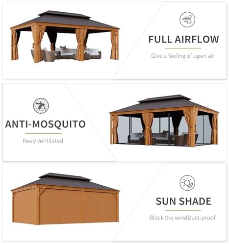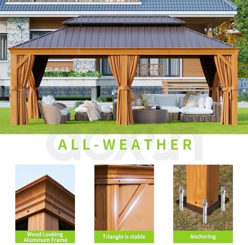 About this item 【Aluminum Frame with Wood Grain】The patio gazebo is produced in sturdy aluminum frames with more environmentally friendly, high performance, high weather resistance powder coat finish that is not easy to scratch, peel, corrode, or rust. The technique of thermal transfer printing makes the frames look like natural wood, improving the overall appeal greatly. Triangular structure improves the overall stability and expansion screws are provided.Note:Maximum Wind resistant grade:6(31-38mph) 【Galvanized Steel Double Top and Water Gutter Design】Selection of powder-coated galvanized steel top, this hardtop gazebo is durable and sturdy enough to endure bad weathers. Furthermore, design of galvanization makes it less prone to rust or corrosion, extending its lifespan to a large extent. The design of professional drainage system enables water to flow from the edge of the gazebo top into the pole and the ground, greatly reducing the troubles of rain or snow accumulation. 【Netting and Curtains】This product is equipped with insect net that has the ability to keep out unwanted pests such as mosquitoes, flies, and other insects, allowing you to enjoy the outdoors without worrying about bites or annoying buzzing. Besides, the 180g polyester curtains can provide privacy and keep the gazebo warm in cold occasions. The netting is useful as it can not only offers the open view but prevents mosquitoes from flying in especially during summers. 【Spacious Room】Designed with the large size of 19.5′ L X 12.0′ W x 8.6′ H, this pergola can accommodate multiple people for various activities such as large gatherings, outdoor dining, and parties. With enough room to breathe and maneuver, it creates an open and inviting atmosphere, making it an enjoyable space for people to converse and engage in activities. 【Assembly & Service】Our outdoor patio gazebo is produced for easy installation and assembly for there are clear instructions and all necessary hardware included.We suggest 3-4 people to finish the installation, it usually takes 4-7hours.