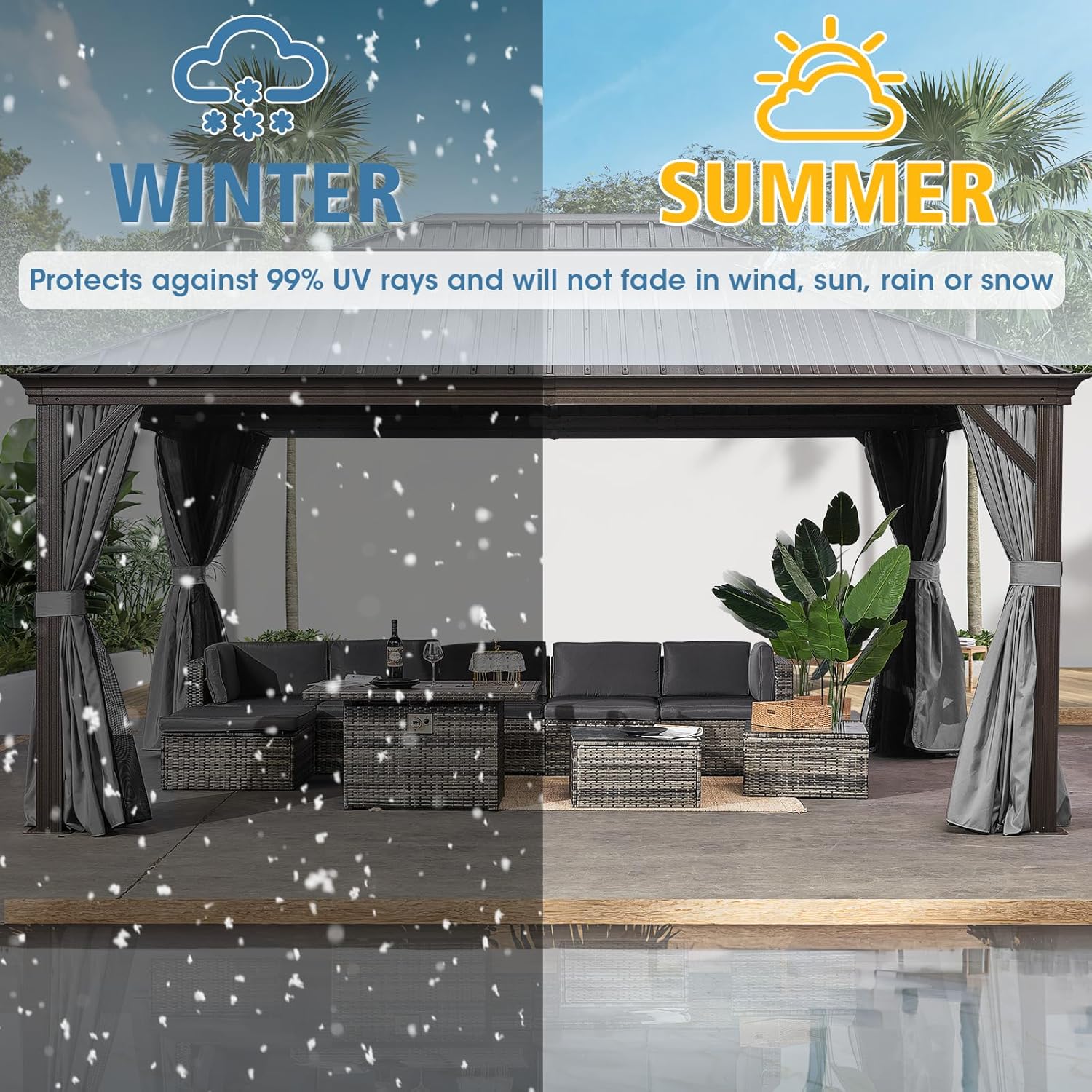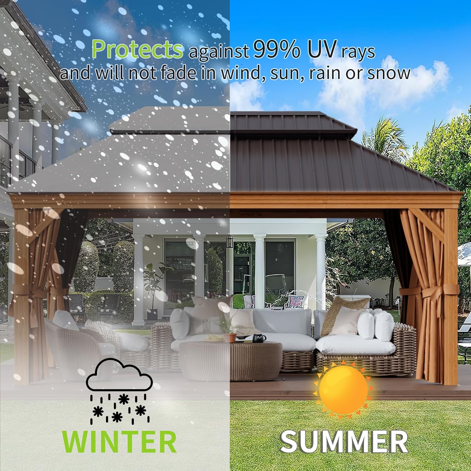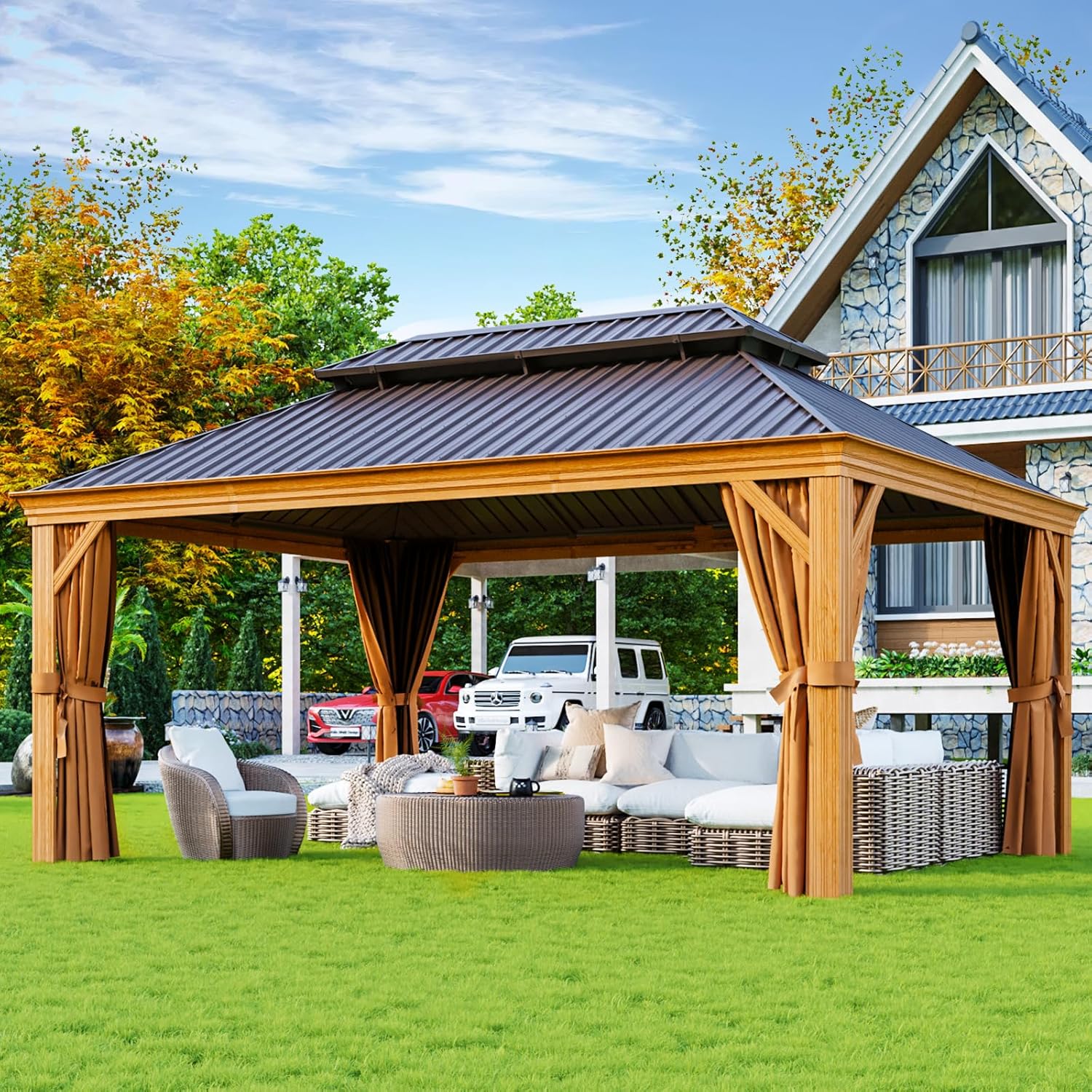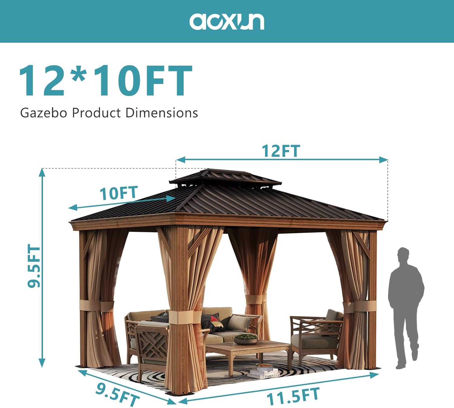 About this item 【Aluminum Frame with Wood Grain】The patio gazebo is produced in sturdy aluminum frames with more environmentally friendly, high performance, high weather resistance powder coat finish that is not easy to scratch, peel, corrode, or rust. The technique of thermal transfer printing makes the frames look like natural wood, improving the overall appeal greatly. Triangular structure improves the overall stability and expansion screws are provided.Note:Maximum Wind resistant grade:6(31-38mph) 【Galvanized Steel Double Top and Water Gutter Design】Selection of powder-coated galvanized steel top, this hardtop gazebo is durable and sturdy enough to endure bad weathers. Furthermore, design of galvanization makes it less prone to rust or corrosion, extending its lifespan to a large extent. The design of professional drainage system enables water to flow from the edge of the gazebo top into the pole and the ground, greatly reducing the troubles of rain or snow accumulation. 【Netting and Curtains】This product is equipped with insect net that has the ability to keep out unwanted pests such as mosquitoes, flies, and other insects, allowing you to enjoy the outdoors without worrying about bites or annoying buzzing. Besides, the 180g polyester curtains can provide privacy and keep the gazebo warm in cold occasions. The netting is useful as it can not only offers the open view but prevents mosquitoes from flying in especially during summers. 【Spacious Room】Designed with the large size of 19.5′ L X 12.0′ W x 8.6′ H, this pergola can accommodate multiple people for various activities such as large gatherings, outdoor dining, and parties. With enough room to breathe and maneuver, it creates an open and inviting atmosphere, making it an enjoyable space for people to converse and engage in activities. 【Assembly & Service】Our outdoor patio gazebo is produced for easy installation and assembly for there are clear instructions and all necessary hardware included.We suggest 3-4 people to finish the installation, it usually takes 4-7hours.
