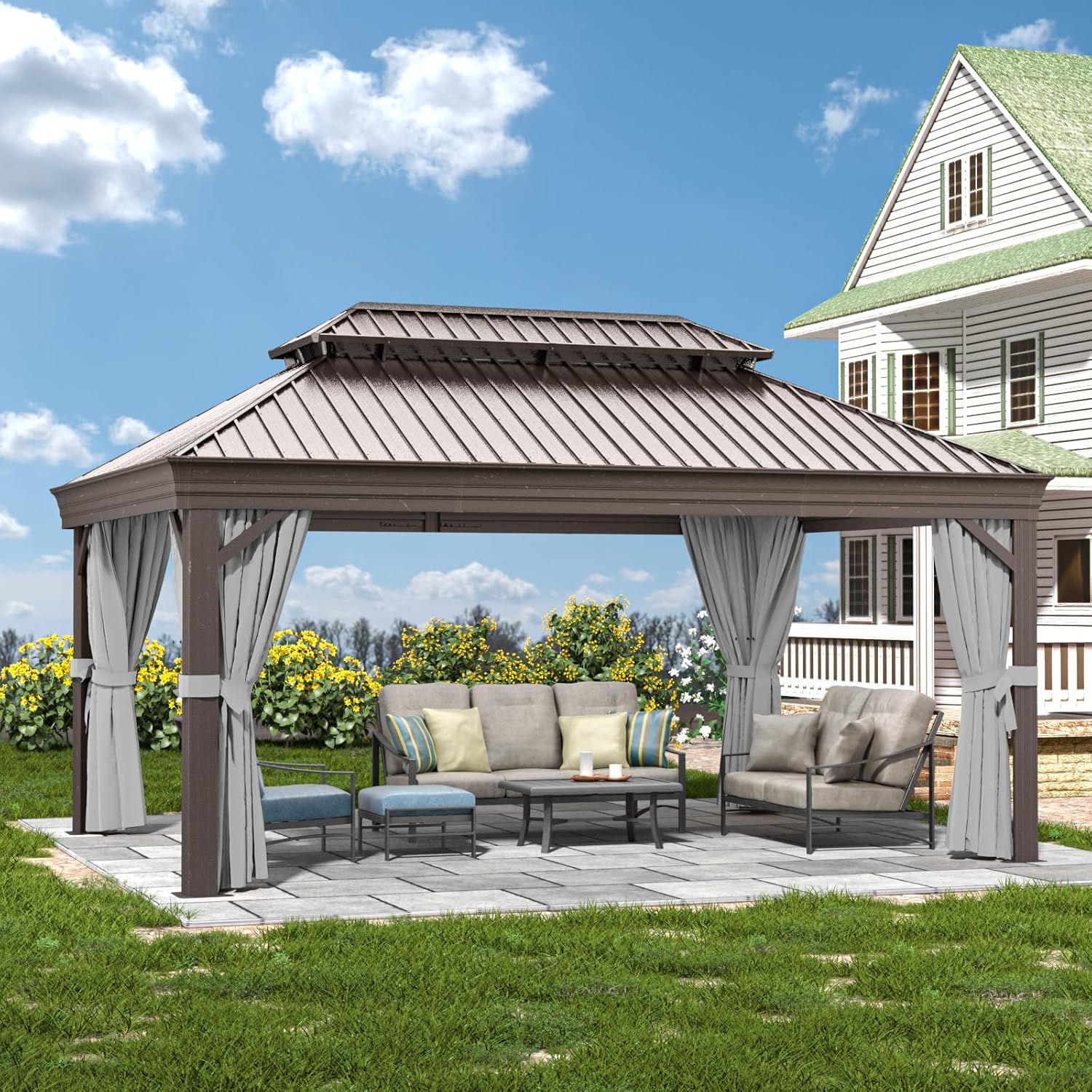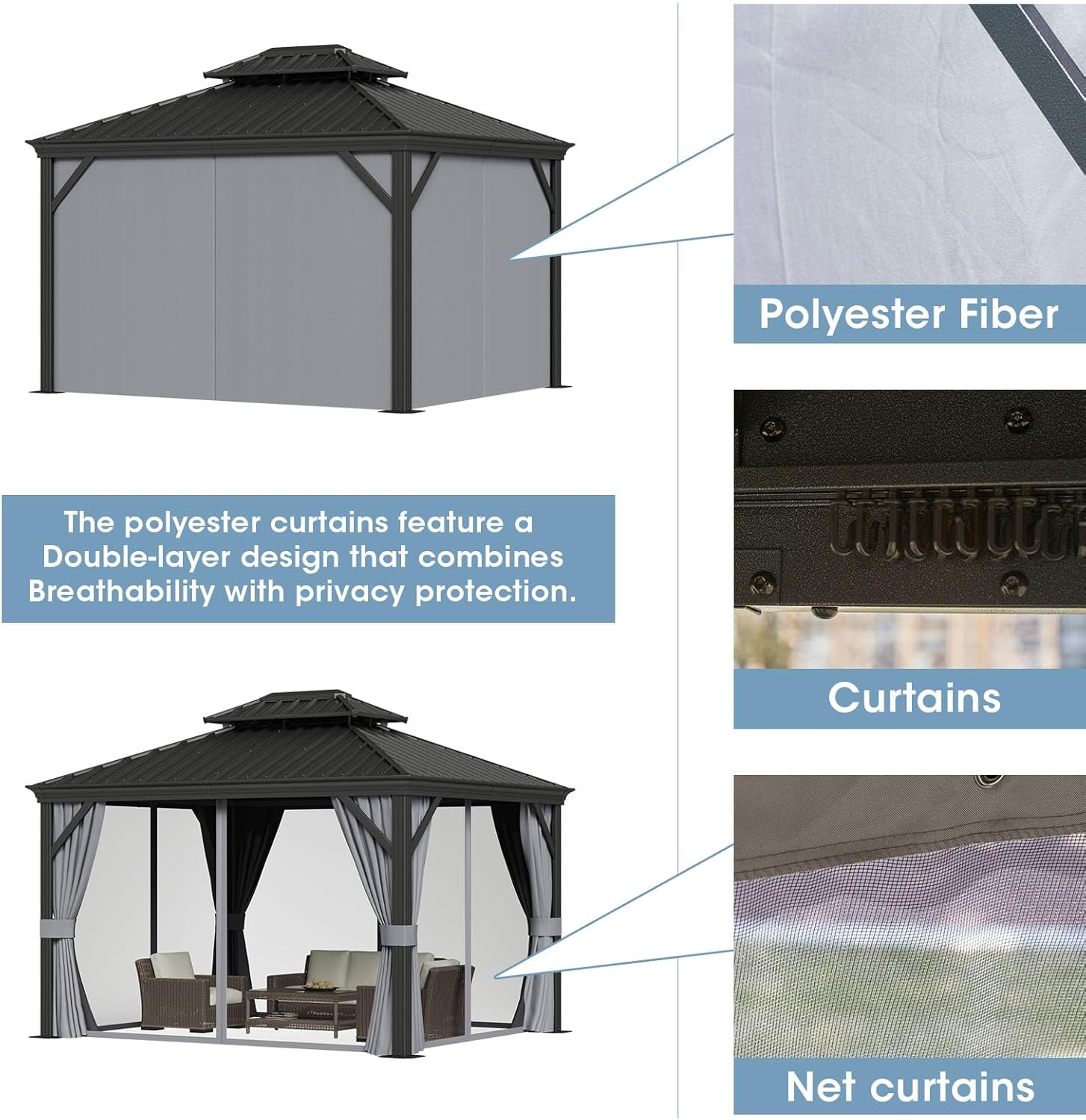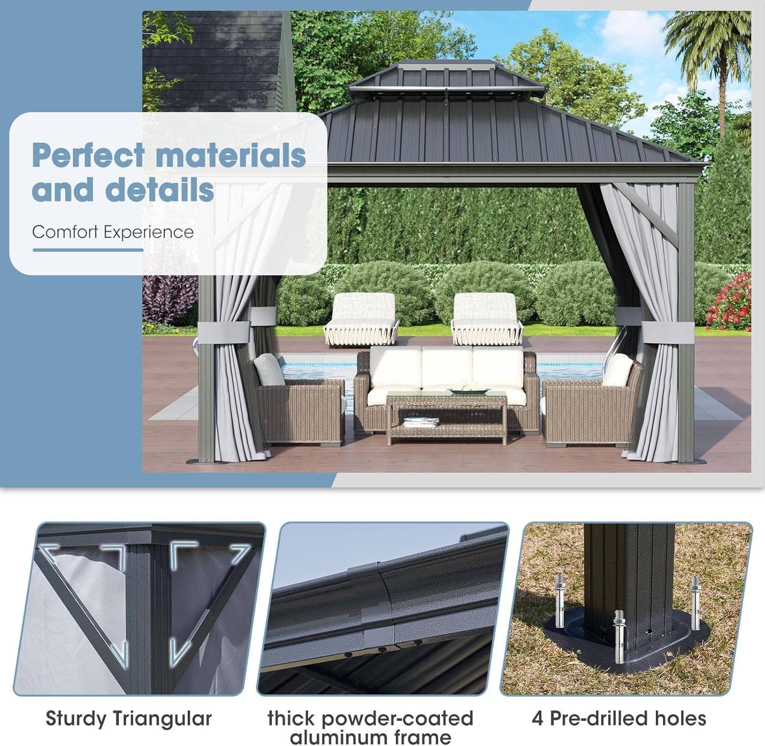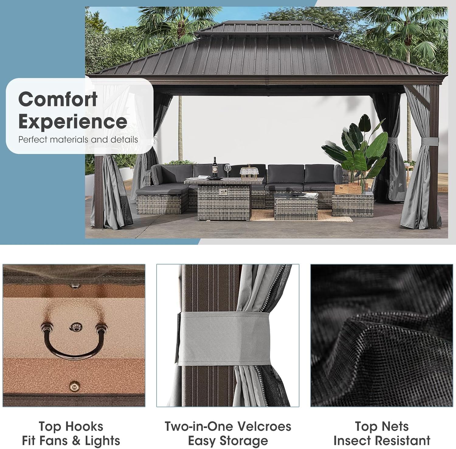 About this item 【Aluminum Frame with Wood Grain】The patio gazebo is produced in sturdy aluminum frames with more environmentally friendly, high performance, high weather resistance powder coat finish that is not easy to scratch, peel, corrode, or rust. The technique of thermal transfer printing makes the frames look like natural wood, improving the overall appeal greatly. Triangular structure improves the overall stability and expansion screws are provided.Note:Maximum Wind resistant grade:6(31-38mph) 【Galvanized Steel Double Top and Water Gutter Design】Selection of powder-coated galvanized steel top, this hardtop gazebo is durable and sturdy enough to endure bad weathers. Furthermore, design of galvanization makes it less prone to rust or corrosion, extending its lifespan to a large extent. The design of professional drainage system enables water to flow from the edge of the gazebo top into the pole and the ground, greatly reducing the troubles of rain or snow accumulation. 【Netting and Curtains】This product is equipped with insect net that has the ability to keep out unwanted pests such as mosquitoes, flies, and other insects, allowing you to enjoy the outdoors without worrying about bites or annoying buzzing. Besides, the 180g polyester curtains can provide privacy and keep the gazebo warm in cold occasions. The netting is useful as it can not only offers the open view but prevents mosquitoes from flying in especially during summers. 【Spacious Room】Designed with the large size of 19.5′ L X 12.0′ W x 8.6′ H, this pergola can accommodate multiple people for various activities such as large gatherings, outdoor dining, and parties. With enough room to breathe and maneuver, it creates an open and inviting atmosphere, making it an enjoyable space for people to converse and engage in activities. 【Assembly & Service】Our outdoor patio gazebo is produced for easy installation and assembly for there are clear instructions and all necessary hardware included.We suggest 3-4 people to finish the installation, it usually takes 4-7hours.