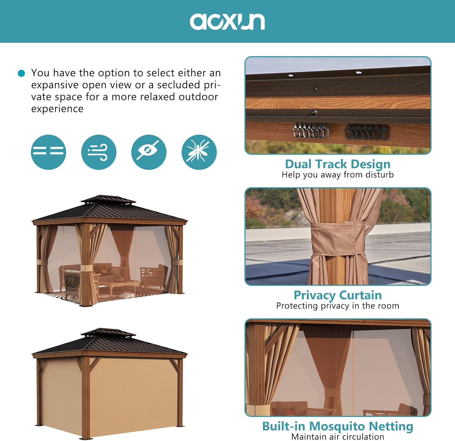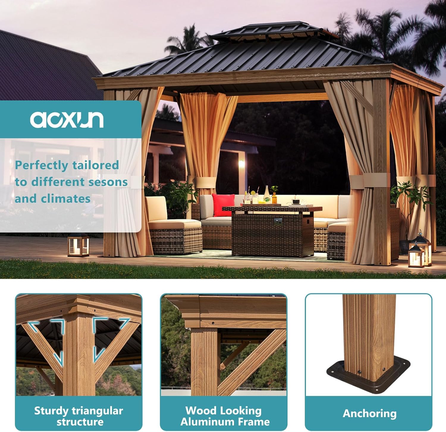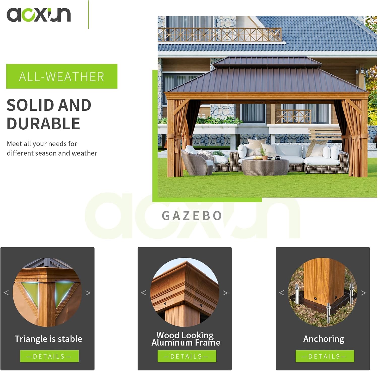 Aoxun 12′ x 20′ Hardtop Gazebo, Wooden Finish Coated Aluminum Frame Canopy, Galvanized Steel Double Top, Outdoor Permanent Metal Pavilion with Curtains and Netting, for Backyard, Patio and Deck