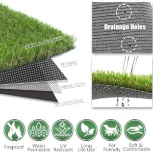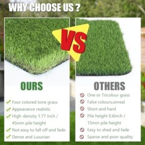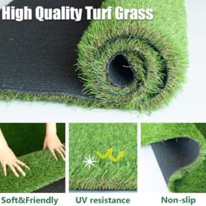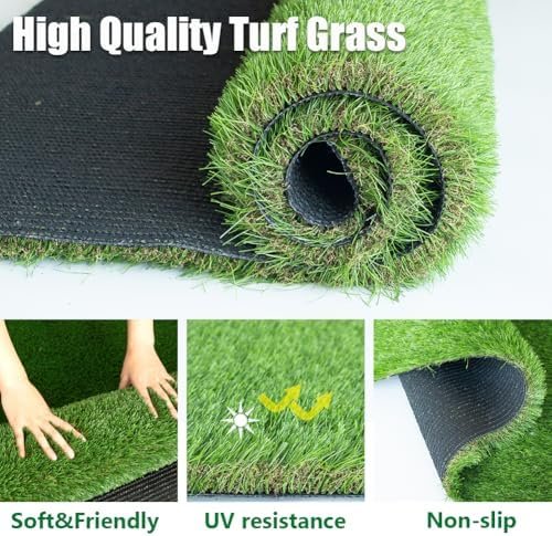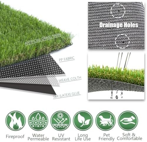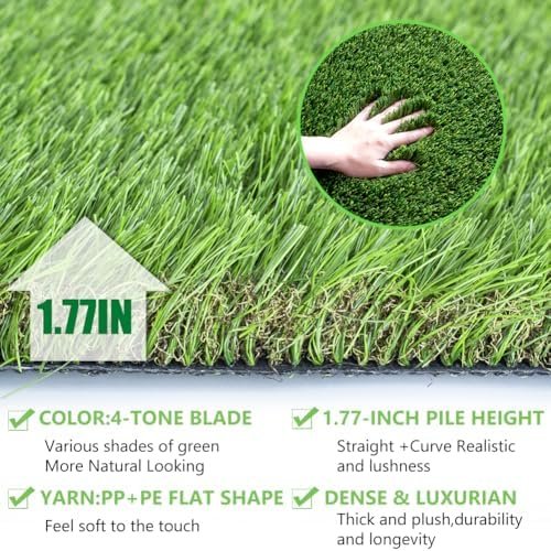 Luxurious Thick & Soft Artificial Grass Rug: The thickened high-density turf with 1.77 inch blade,with 4 Tone Design, lush and luxurious, soft and beautiful landscape grass. C-shaped yarn, upright and natural looking.Feels nice and fresh on bare feet. offering a soft and comfortable surface that mimics the lushness of natural grass,allowing you to have a natural setting for your patio, balcony, front yard, backyard, bringing you the natural feel High-end Quality Synthetic Grass Mat : Made of high PE &PP synthetic material, safe for kids and pets. UV, fire and corrosion resistant.Designed with drainage hole, no stagnant water and dry quickly in the rainy season. providing a premium and elegant appearance that enhances any outdoor or indoor space Usage: Pet Area, Residential, Industrial, Commercial usage applicable? both indoor or outdoor multi-use. Perfect for yards,patio,deck,backyard, fields, golfing, parks, schools, events, or to spruce up any open space or firm ground! Can be used as house decoration, on the roof or a balcony, as a prop for theatrical or film sets, swimming pool area, a terrace or villa, etc. Low-Cost Maintenance Safe for Pets and Children:Synthetic turf requires minimal upkeep, eliminating the need for watering, mowing, or fertilizing. Its durable materials retain their vibrant appearance for years, reducing long-term expenses. Cushioned backing and non-abrasive fibers create a gentle surface for children to play and pets to roam Easy to Install & Clean: Lay and place the turf lawn and you are done! Even don’t require any infill for high traffic, you can also easily cut the lawn into any shape you need for the irregular area; With the enlarged drainage hole, it can drain quickly. As for the urine smell, just rinse it off and let it dry